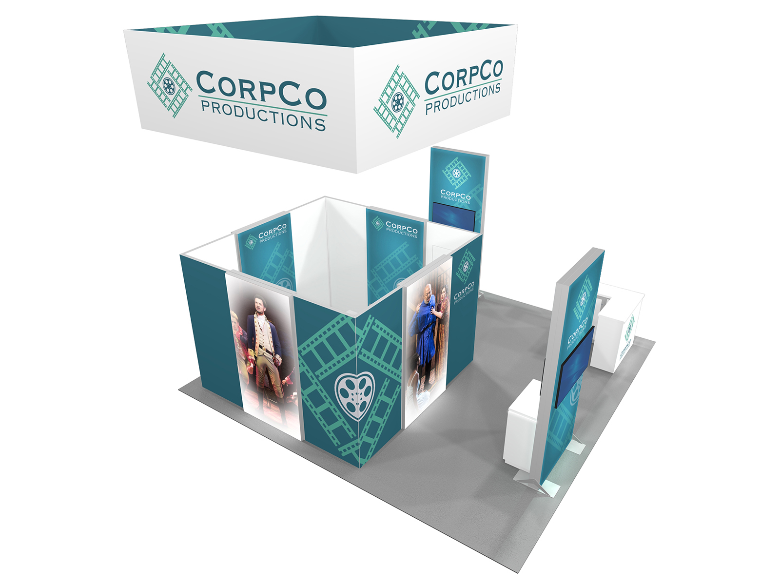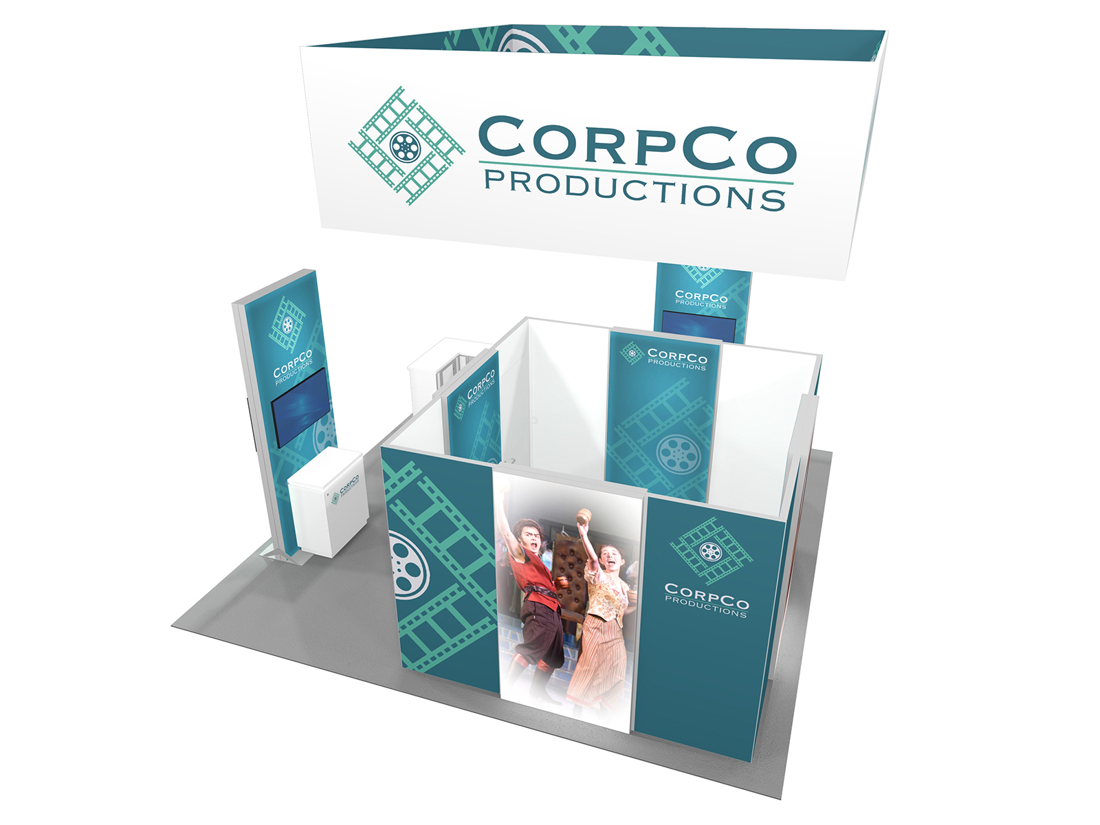 Quite often, a few custom elements added to the design can give the entire design a custom look even if it’s as simple as some colorful laminated workstations, shelves, or a reception counter. Custom laminated soffits and backlighting are also nice touches that are inexpensive and well worth the investment. As a bonus, if you re-rent the same exhibit, your second rental will most likely be less expensive, since your first rental covered the cost of those custom components.