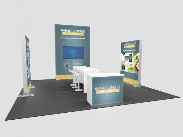 Quite often, a few custom elements added to the design can give the entire design a custom look even if it’s as simple as some colorful laminated workstations, shelves, or a reception counter. Custom laminated soffits and backlighting are also nice touches that are inexpensive and well worth the investment. As a bonus, if you re-rent the same exhibit, your second rental will most likely be less expensive, since your first rental covered the cost of those custom components.