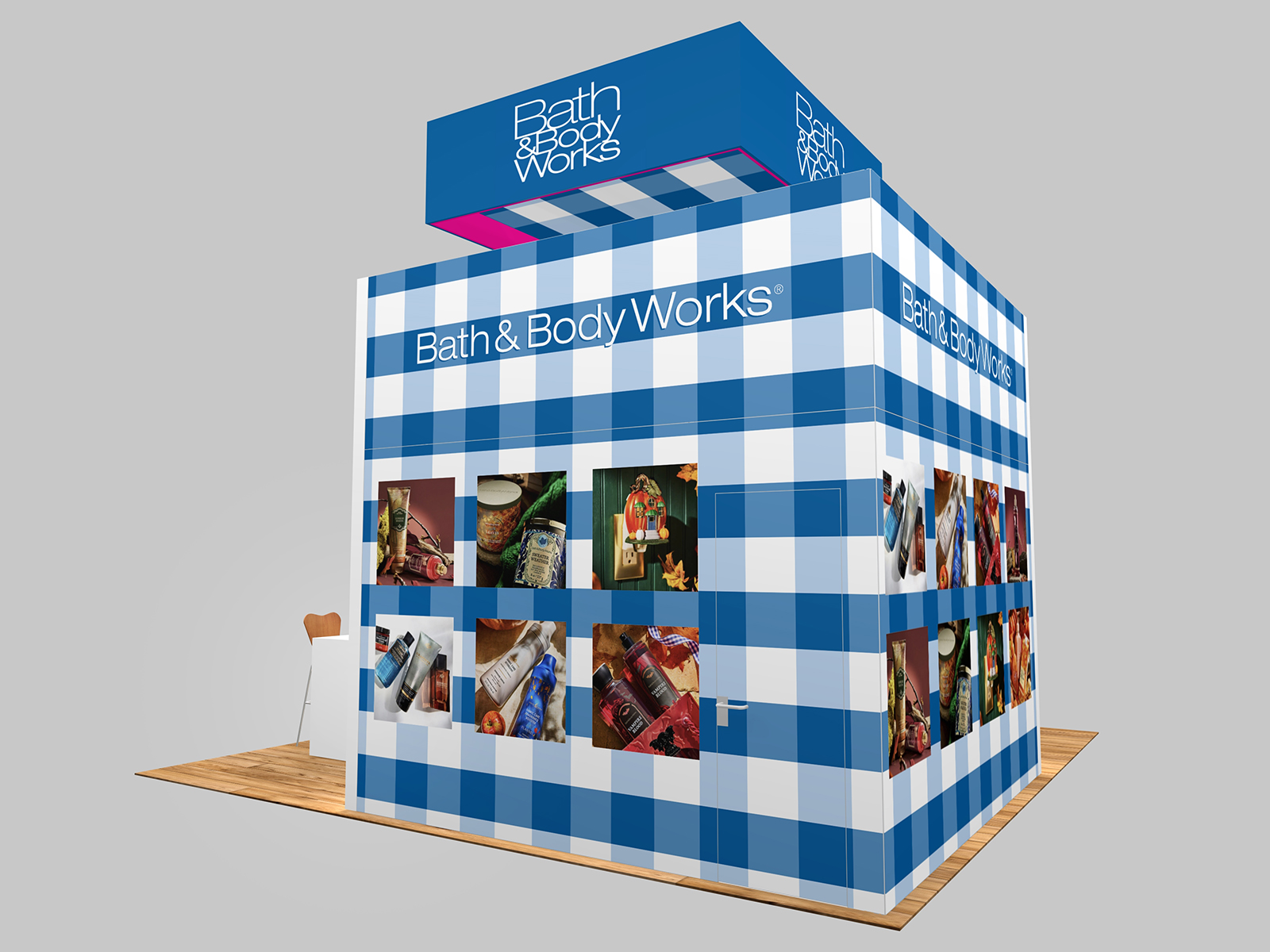 Visually, the design has (2) single-sided LED lightboxes and (2) double-sided lightboxes and large format fabric graphics along the back and front of the tower. For maximum visibility in the show halls, there’s a large square hanging sign with a graphic ceiling. The reception counter has LED accent lights and locking storage.