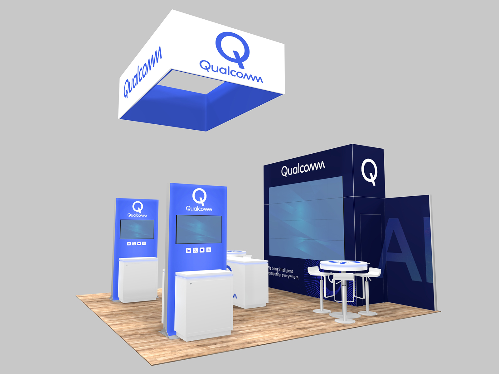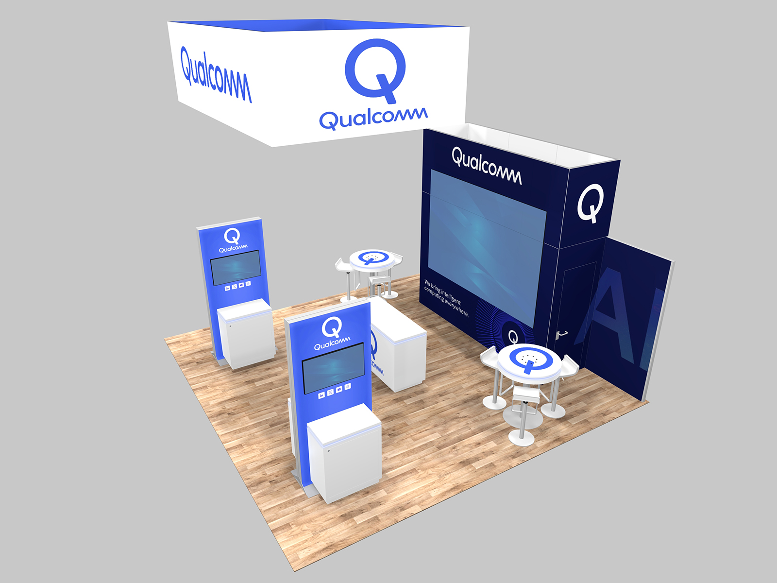 An open island format encourages attendees to step into the booth space. This 20 x 20 island features three open sides with access to video demo stations, casual seating, and a reception counter. Above the booth is an overhead hanging sign for maximum visibility in the trade show hall.