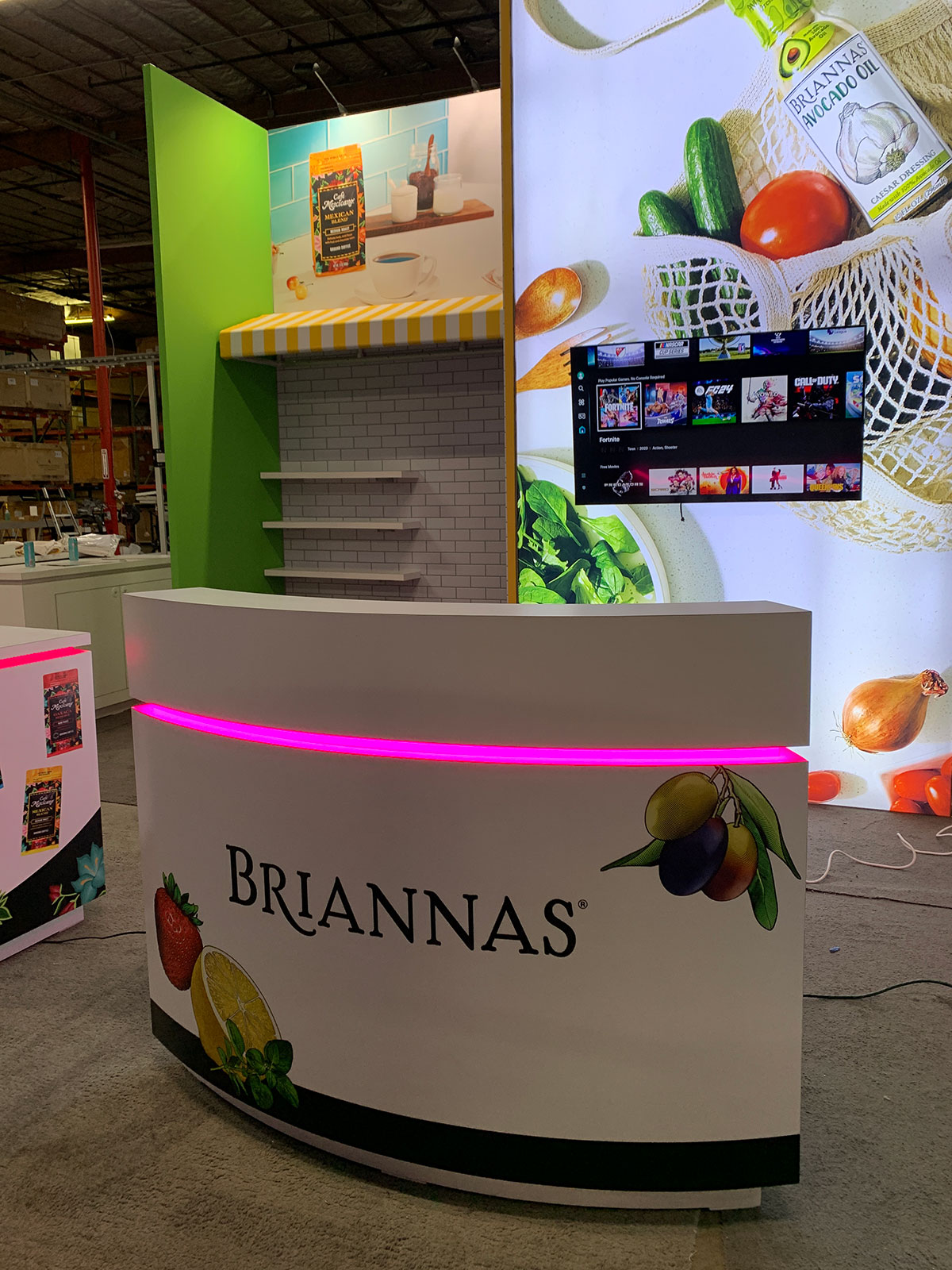 Logo Sign, Shelves, Pony Wall, Monitor Mount, and Custom Counter