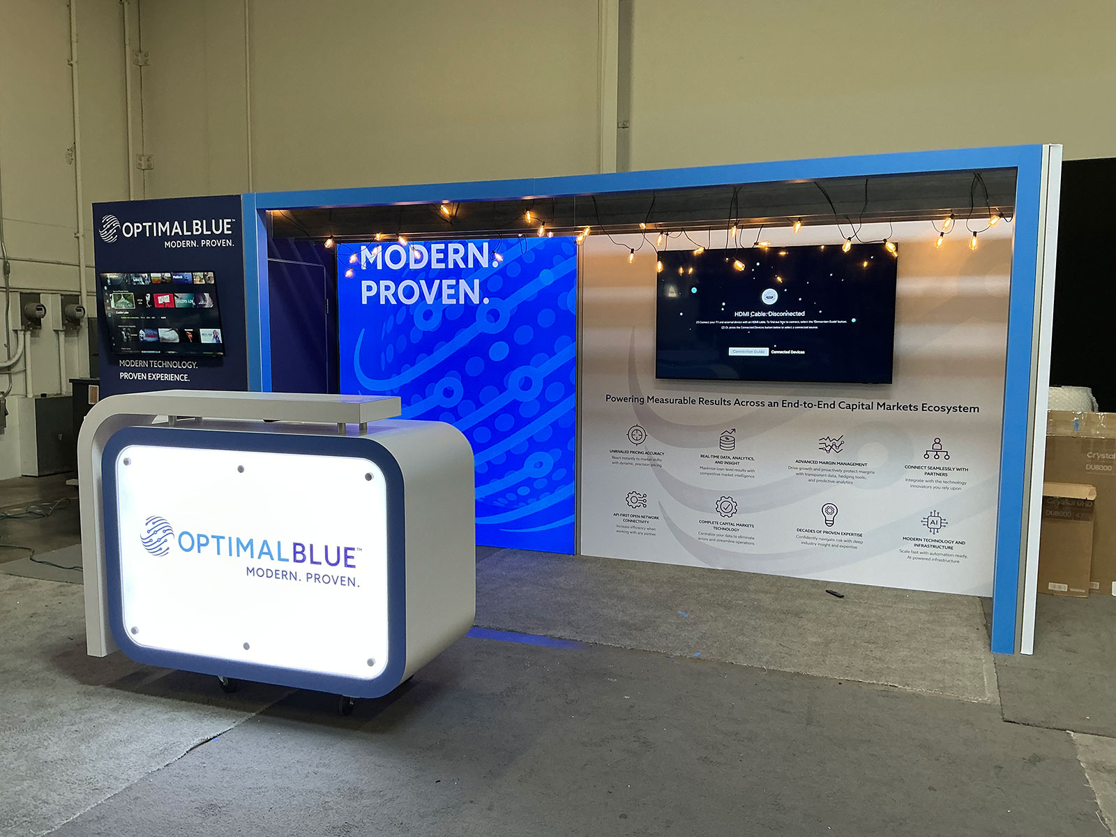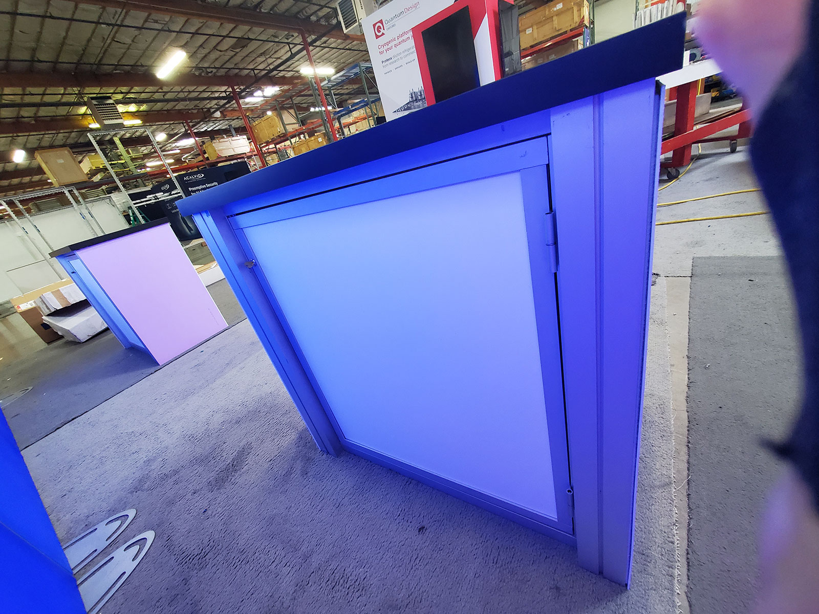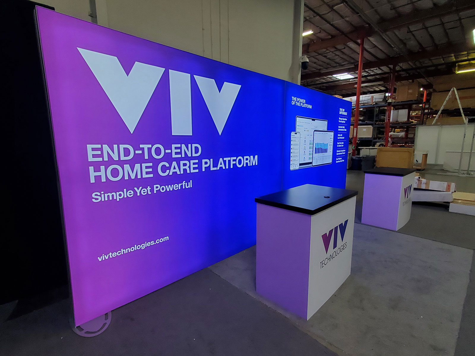 Modified VK-1340 Custom Exhibit with Backlit SEG Fabric Graphic and MOD-1563 Counter with LED Accent Lights and Locking Storage [ORD-70409]